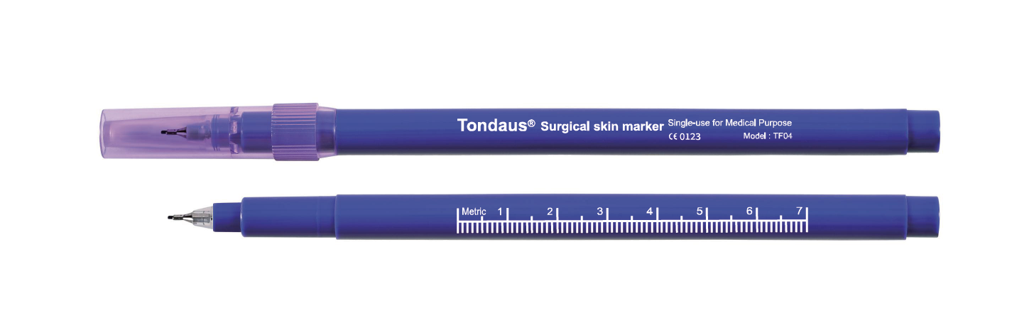 Tondaus®医用皮肤记号笔种类繁多,墨水颜色以紫色为主,广泛应用在人体皮肤上的普通手术、肠道外科手术、骨科手术、神经激素手术、心血管手术和放射治疗等,为医生在手术过程中标记提供便利。近年来,唐德医用皮肤记号笔受到了整容整形行业的广泛欢迎。