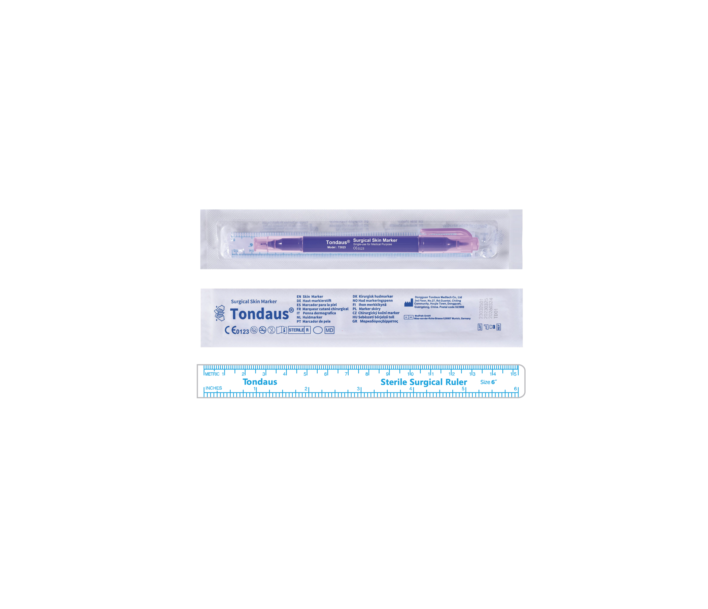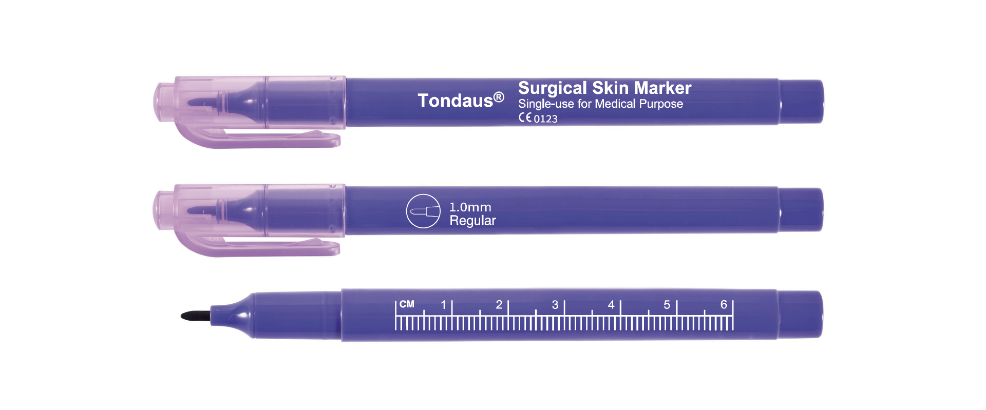 Tondaus®医用皮肤记号笔种类繁多,墨水颜色以紫色为主,广泛应用在人体皮肤上的普通手术、肠道外科手术、骨科手术、神经激素手术、心血管手术和放射治疗等,为医生在手术过程中标记提供便利。近年来,唐德医用皮肤记号笔受到了整容整形行业的广泛欢迎。